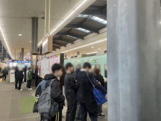 △ 平日AM7:43発 福岡天神行急行電車待ちの様子。