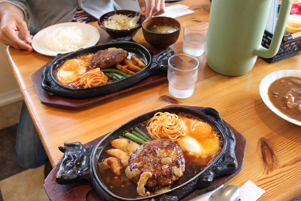柔らかくてとってもおいしいハンバーグ。写真はハンバーグシングル。牛の鉄板がかわいい!