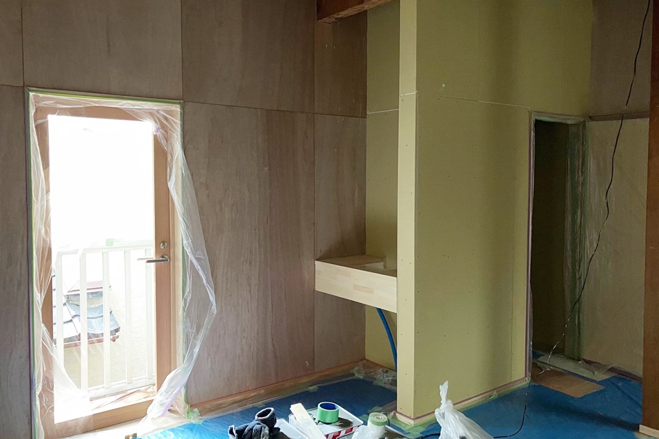 壁を白く塗装するために、既存の壁の上に下地を貼っています。