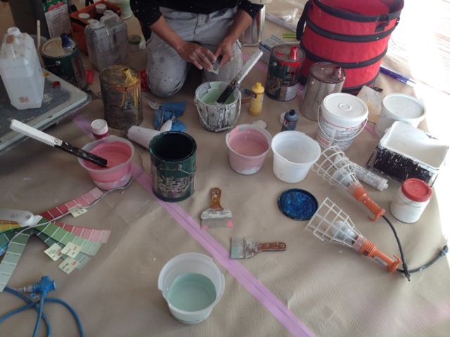 この部屋にとっては部屋の雰囲気が決まる肝心なところ。色見本を見るなり手早くイメージに近い色に調色していくイケメン塗装屋さん。微妙に色の違う、3色のうぐいす色を作ってもらいました。