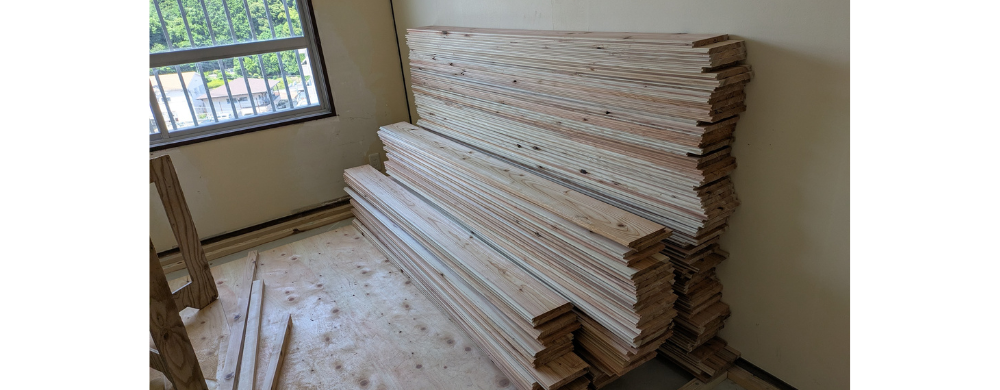 工事中の303号室に使われているフローリング材は、糸島・真名子で切り出された8本の木から作られました。一本の木から材木として採れるのは6割程度。端材は玩具にしたり、皮で草木染めをしたり、さらには肥料や燃料チップなどに活用されるそうです。今回フローリング材をご用意していただいた「NPO法人いとなみ」さんが皮むき間伐体験を定期開催されているので、興味がある方は覗いてみてください。