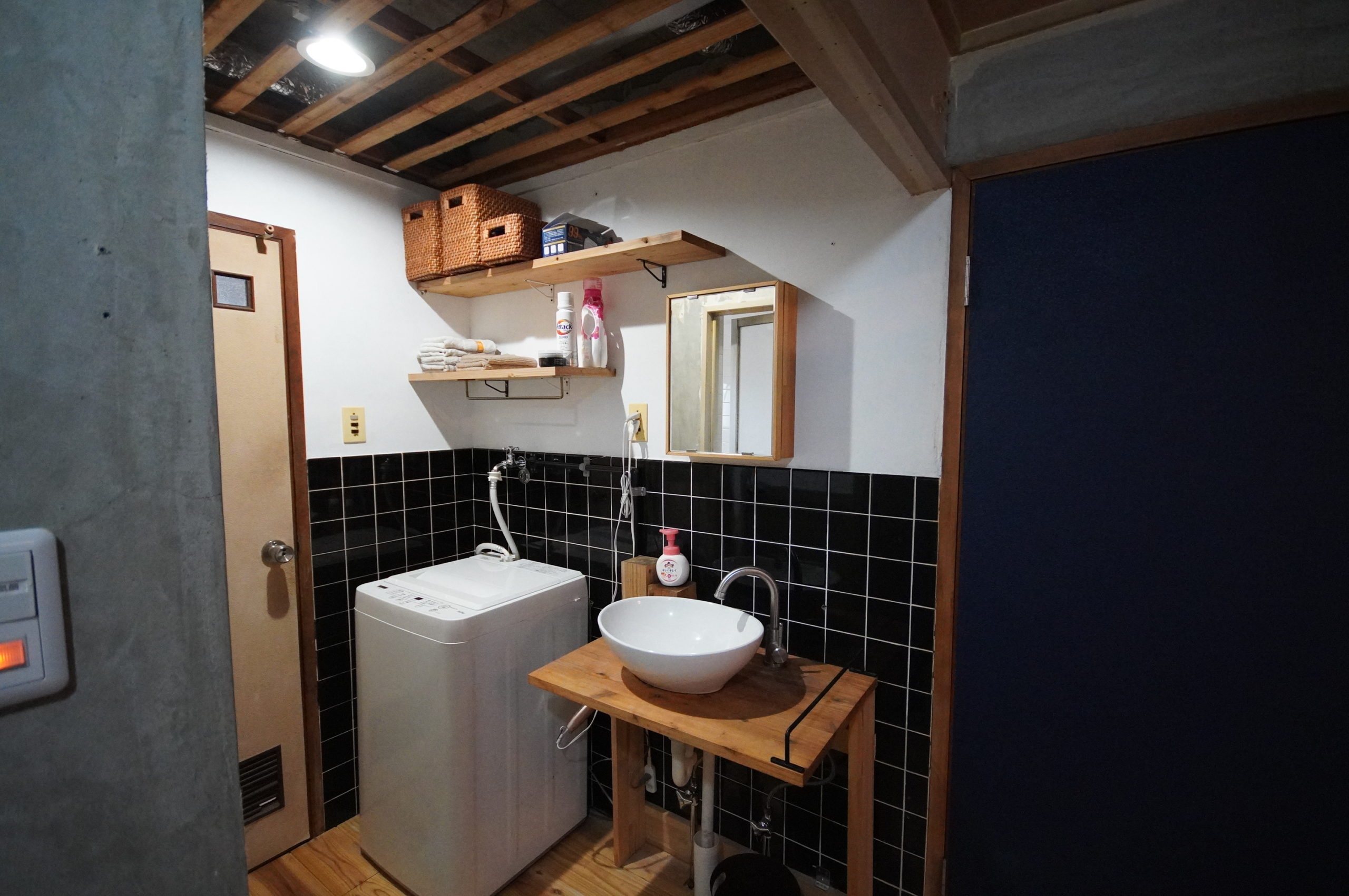 funker room(建築当時の改装されていない状態のお部屋を、入居者さんが自分好みにDIYできる賃貸)の1室で、床の張り替えや洗面台など素敵にDIYされています。