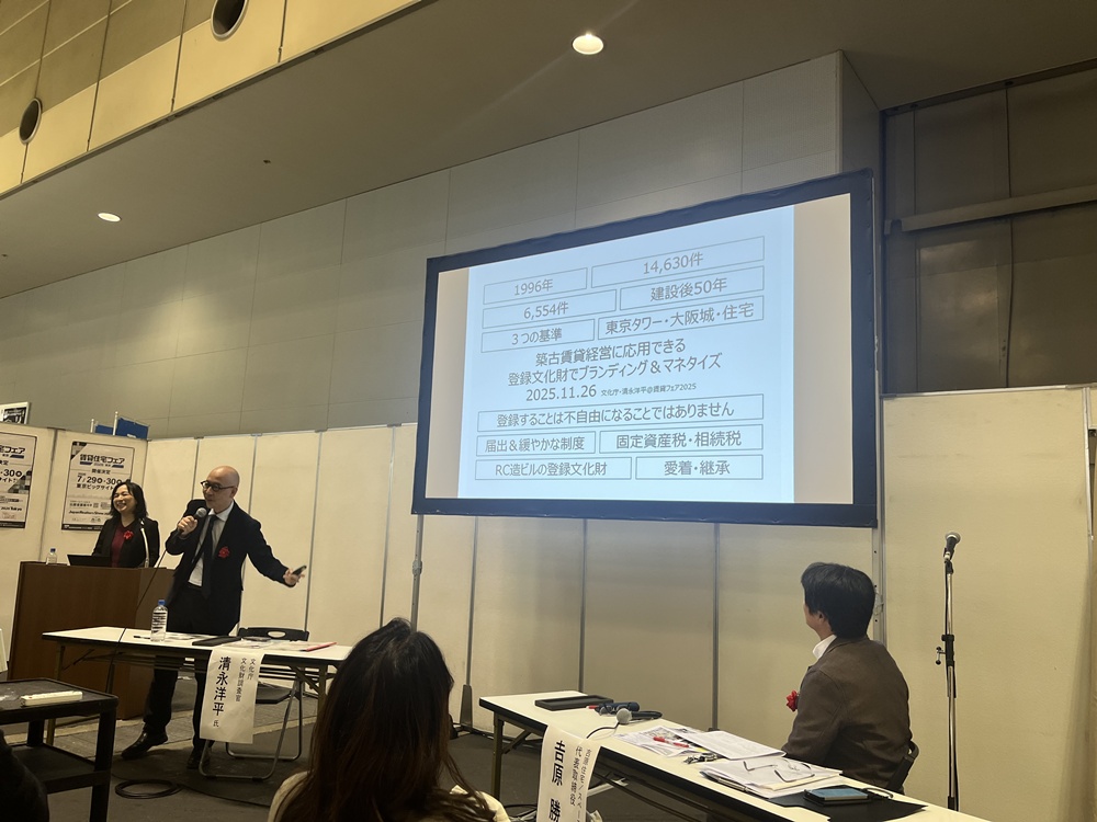 国の登録有形文化財について、清永さんより「文化財=保存」ではなく、「使い続けながら価値を高める」という考え方であること、また吉原からは建物の価値を「経済性」だけで測るのではなく、文化的な意味とともに育てていく賃貸経営の考え方についてお話させていただきました。