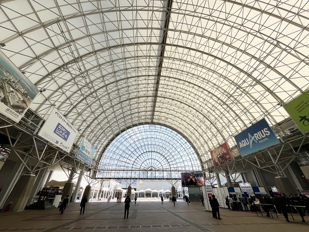 (賃貸住宅フェア大阪会場「インテックス大阪」。立体トラス+膜構造が印象的な建物でした。)