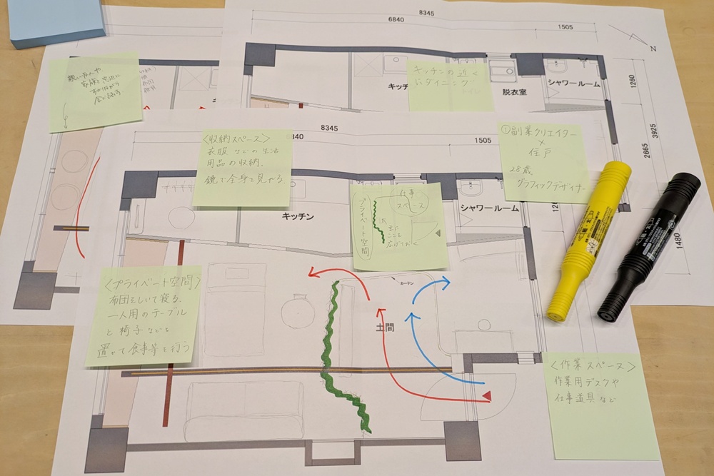 ワークショップでは、この45㎡の空間を自分たちのライフスタイルや趣味に合わせて再定義しました。またペルソナを設定し、SOHO利用時の使い方についても考えていただきました。