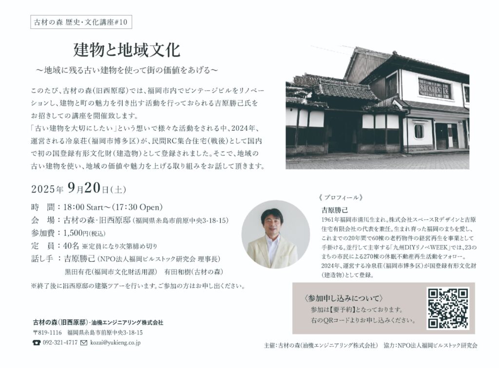「古材の森」(糸島市)にて開催される「歴史・文化講座#10 「建物と地域文化」~地域に残る古い建物を使って街の価値をあげる~」に、弊社代表の吉原が登壇させていただきます。