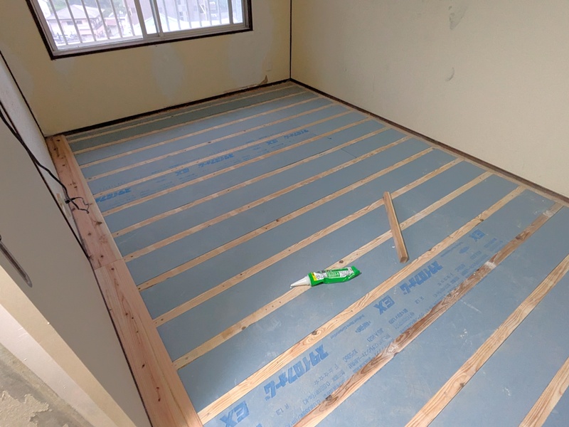 LDKと西側の個室について、無垢床の裏に高性能断熱材30㎜を施工して床の断熱性をアップしました。