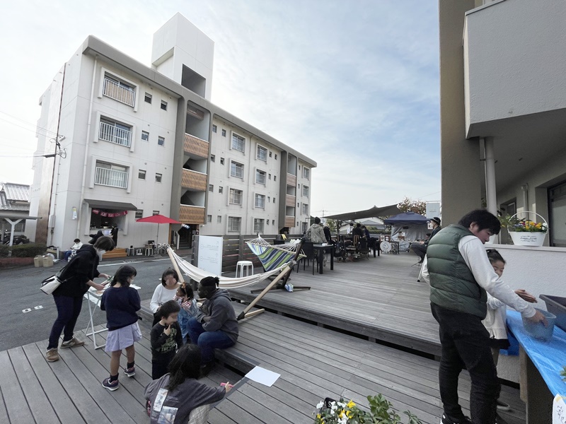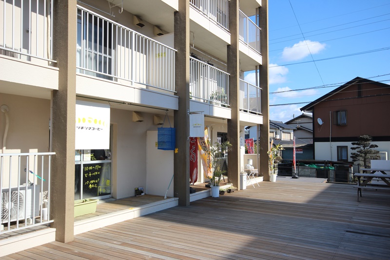 それらのお店に併設するウッドデッキでは、買い物に訪れた主婦やお散歩中のご近所さん、登下校中の子供らがふらりと立ち寄り、コーヒーやパンを片手に休憩したり、おしゃべりしたり、元気に走り回ったりと、こちらも思い思いに楽しんでいる姿がみられます。