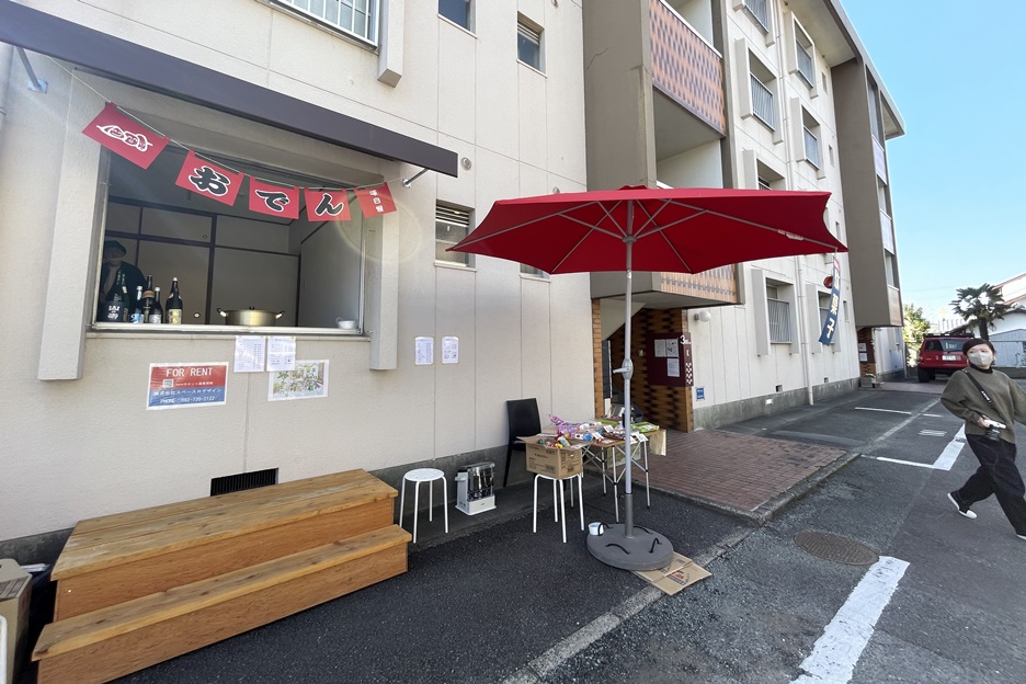 窓の北側の駐車場スペース(白線内)は、来客の動線として階段や踏み台を設置するほか、商品の陳列や飲食用のベンチの設置などの専有使用が可能です。