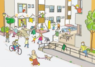 棟と棟をつなぐように、人が循環し賑わいが生まれる様子が描かれています。